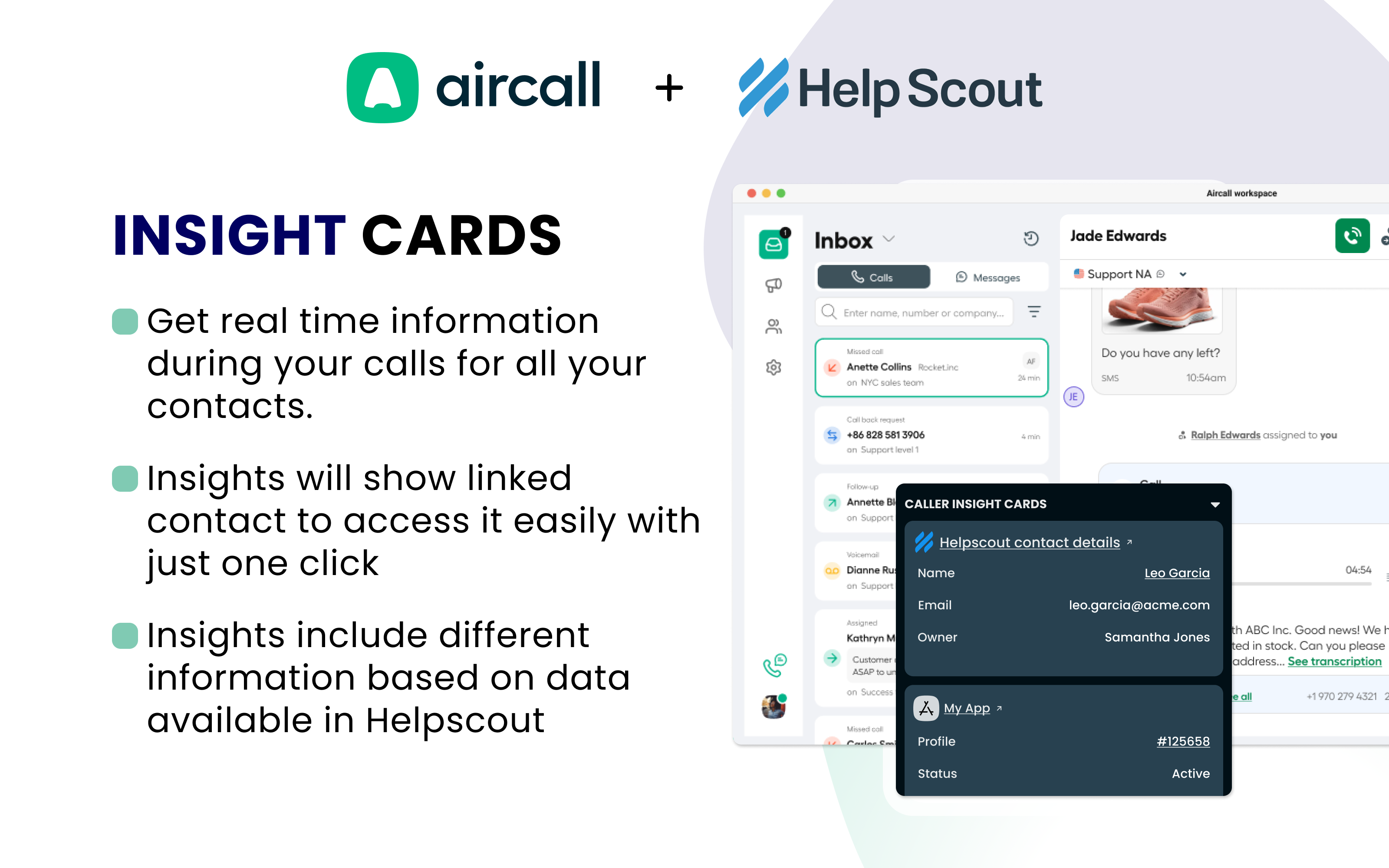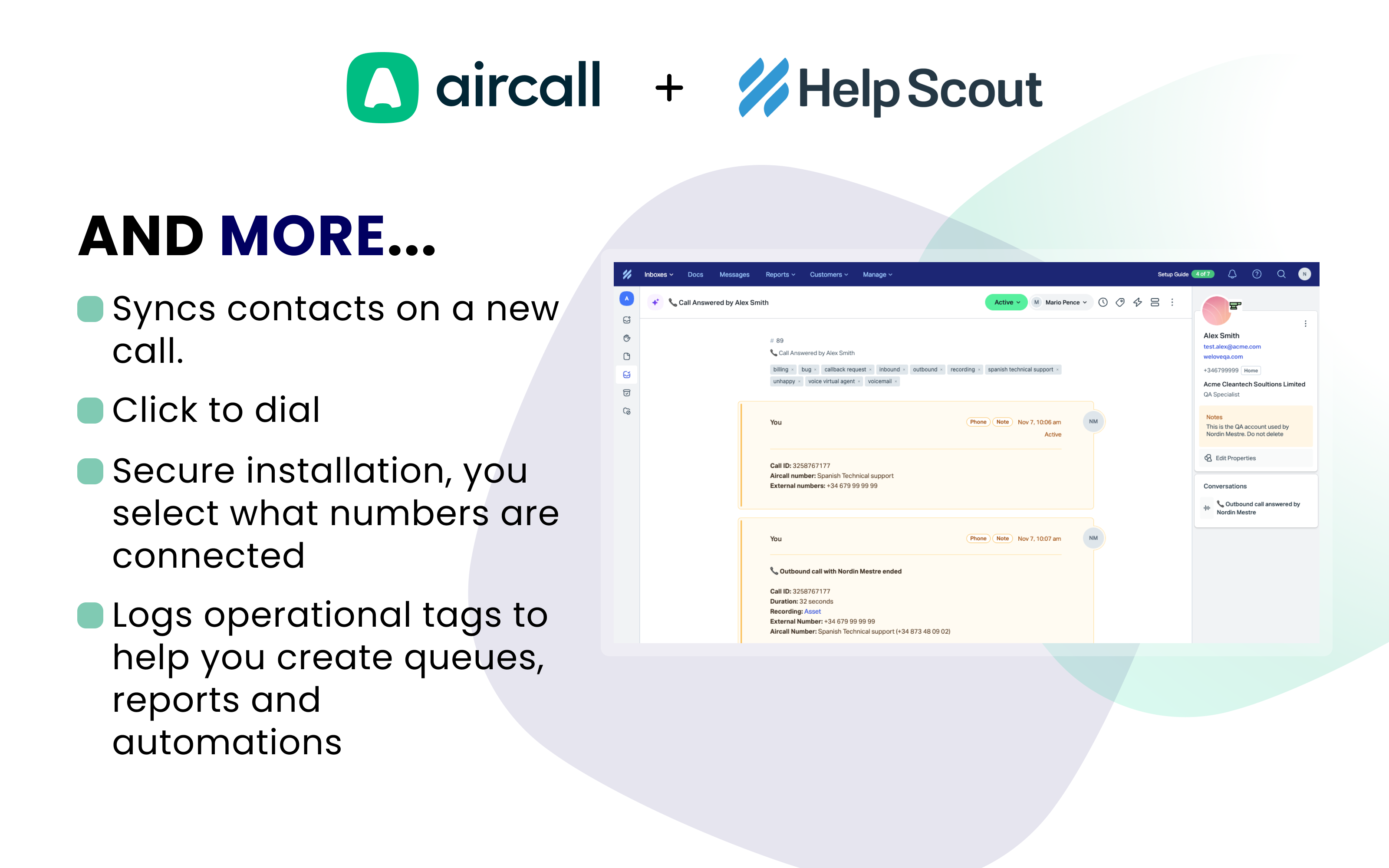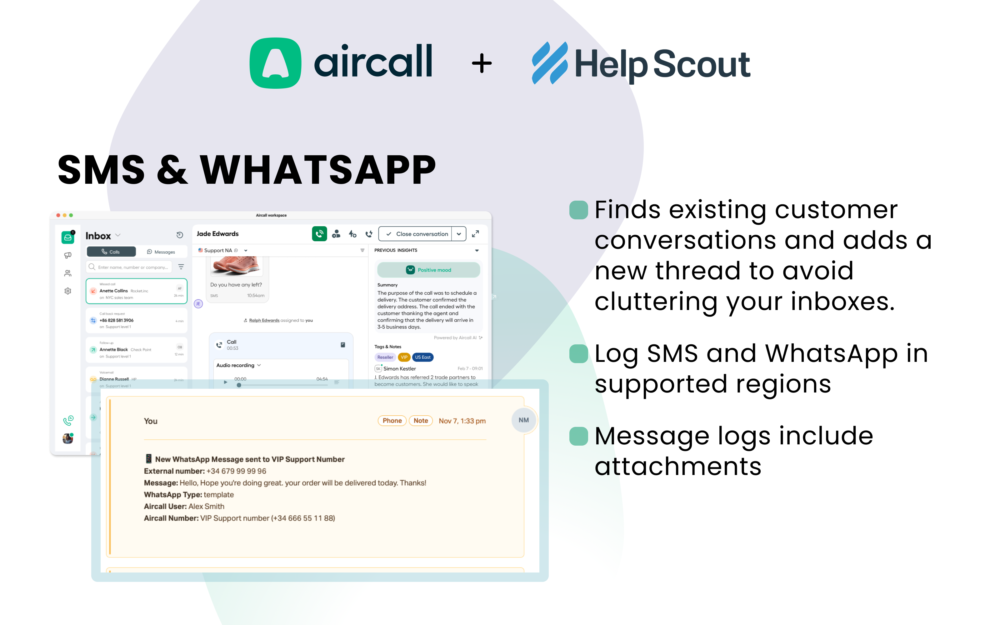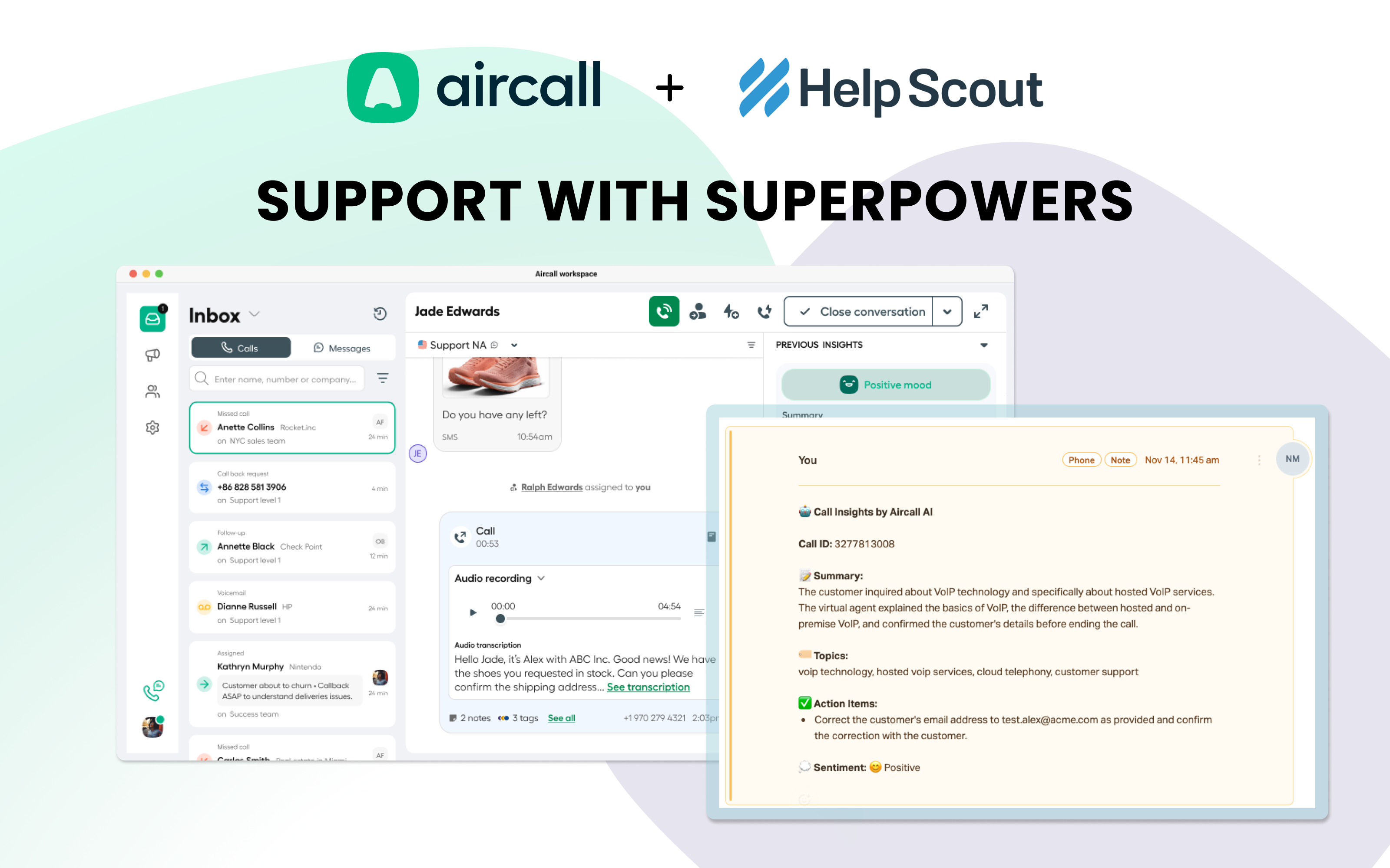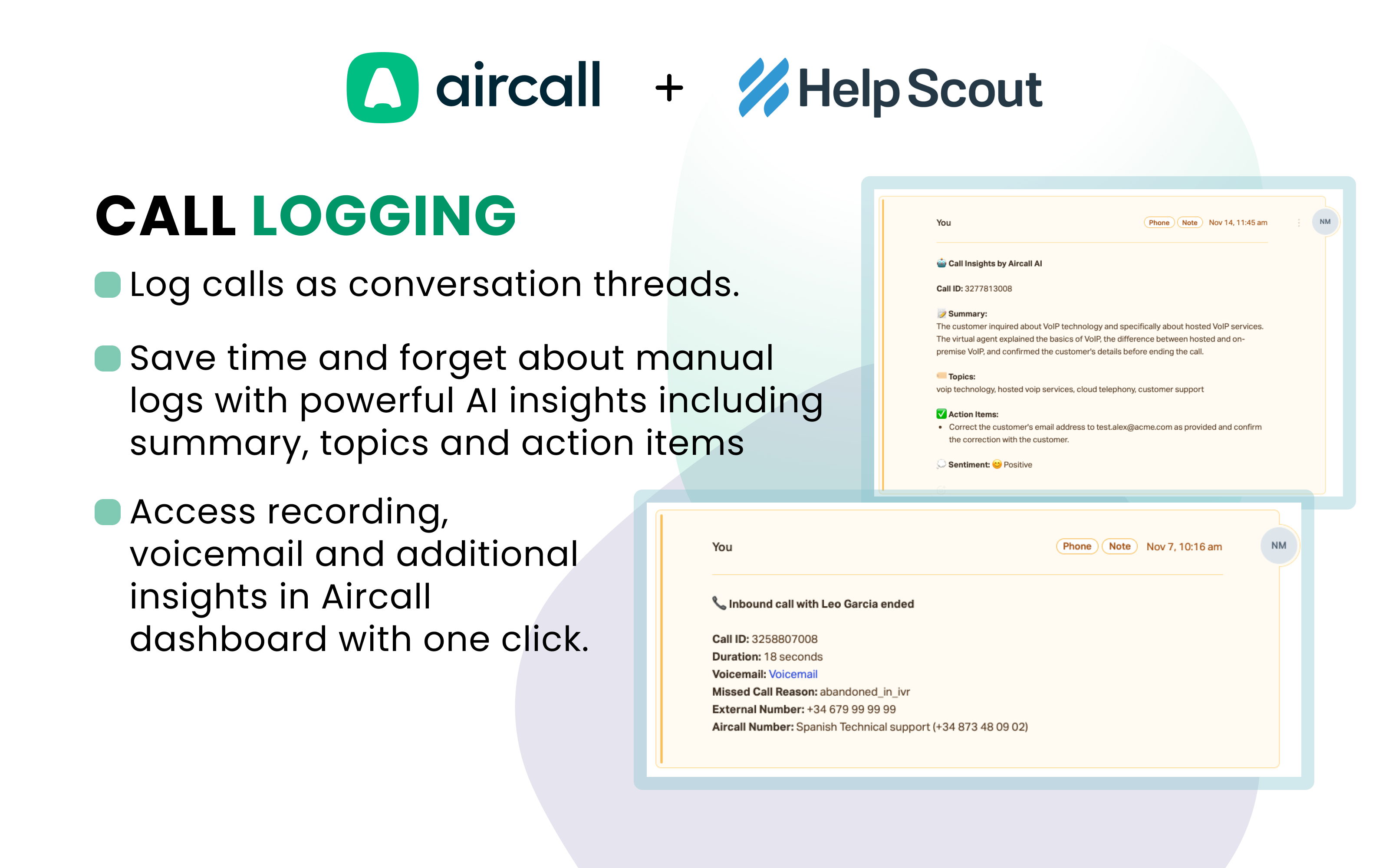 Bring intelligence to your Help Scout workflows. For customers subscribed to Aircall AI features, the integration logs: Call summaries, Key topics, Action items, Customer sentiment, Full call transcriptionsSMS & WhatsApp Logging