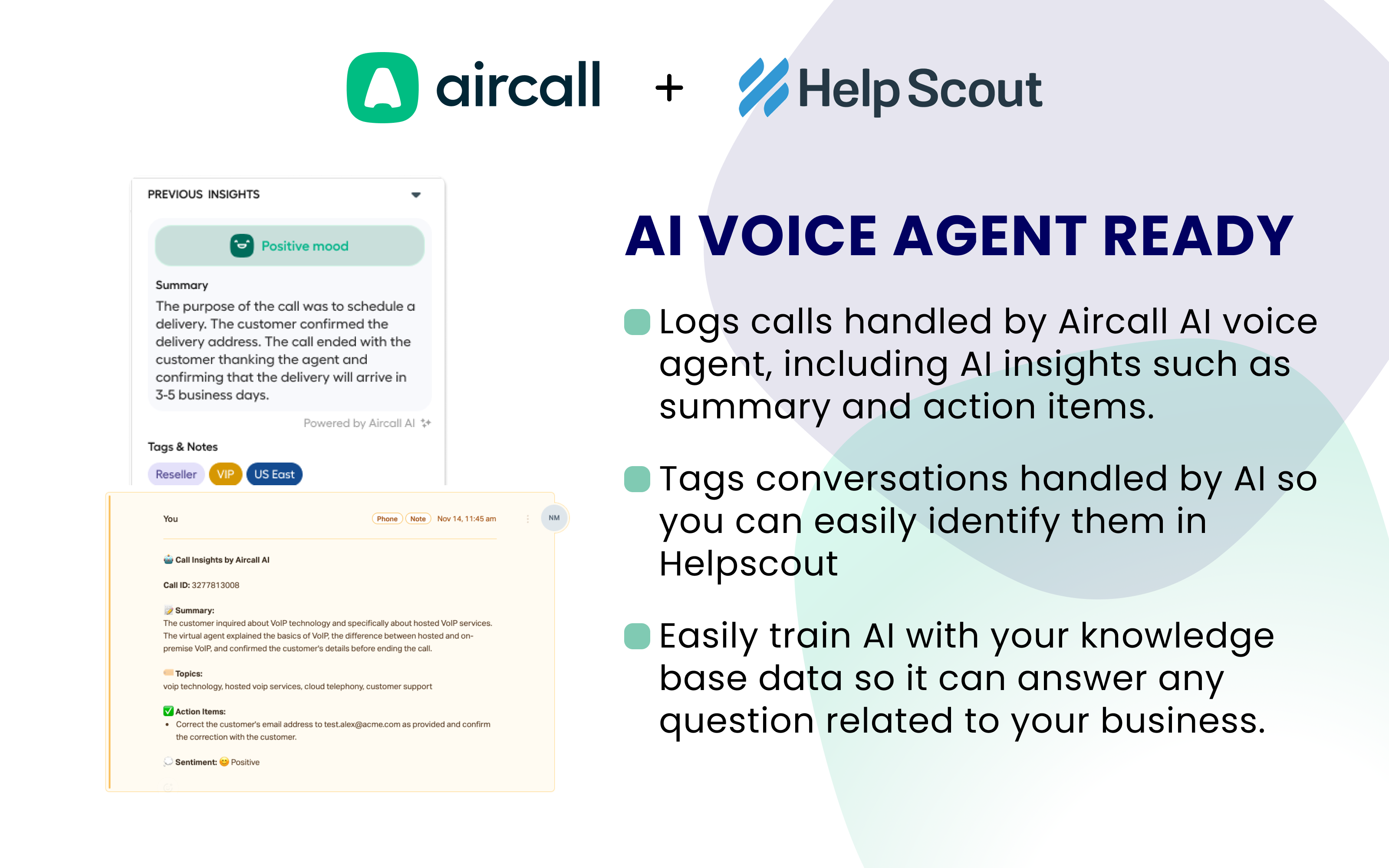 Aircall tags added by agents sync into Help Scout conversations, along with automatic operational tags such as missed call, callback, voicemail, call direction, team name, and number labels.Voice Agent Ready